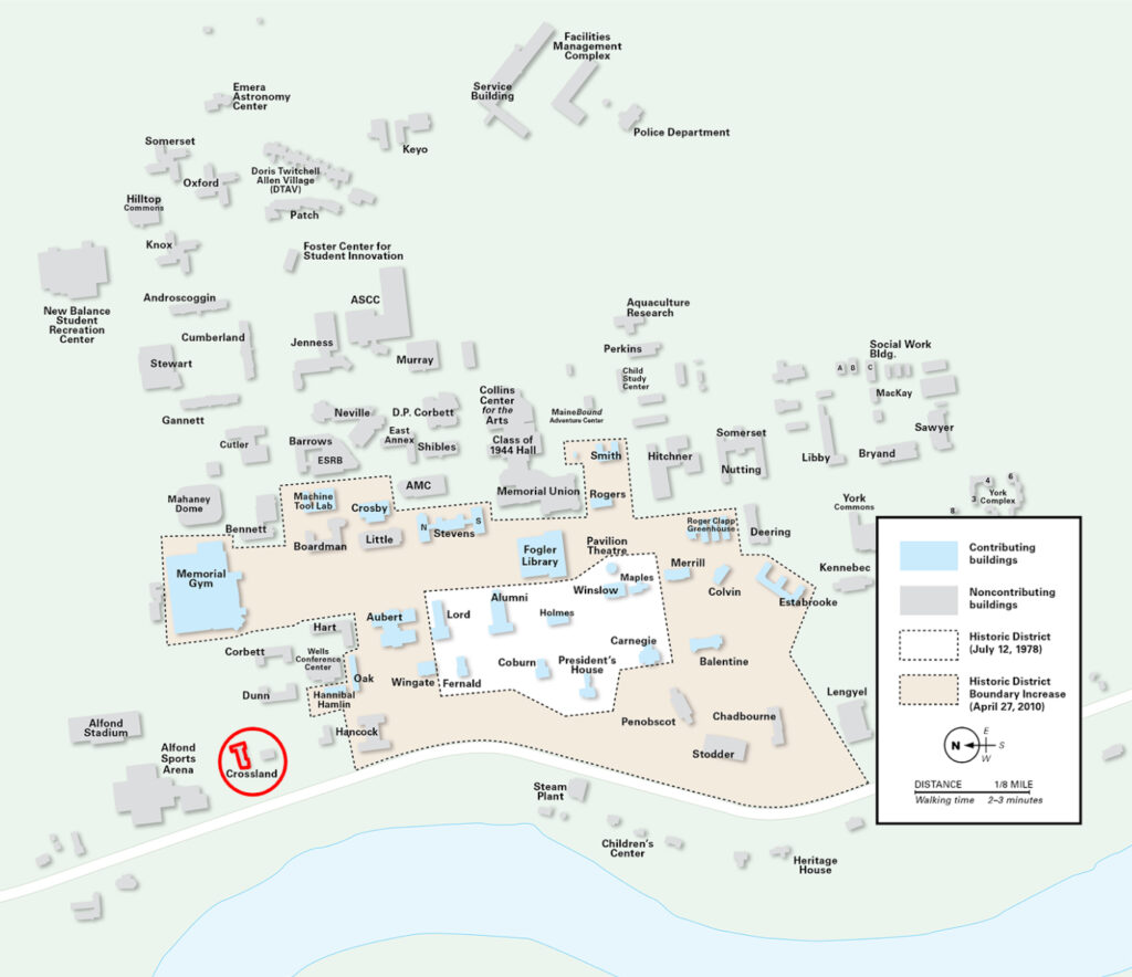A map of the UMaine Historical District, with Crossland Hall circled in red. Image screenshot from UMaine’s Space & Capital Resource Management website.