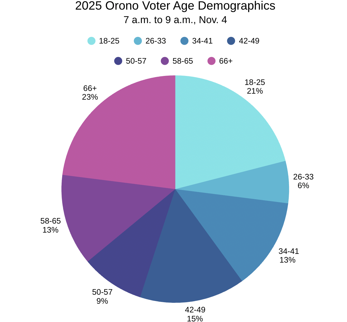 Of the community members who participated in an interview during the first two hours of the polls opening, the majority of voters were above the age of 65. The second-largest age range was 18 to 25 years old, made up of 21 voters. The age range with the least amount of interviewed morning voters is 26 to 33 years old, with only six voters. The oldest voter who spoke with the Maine Campus was 87 years old.