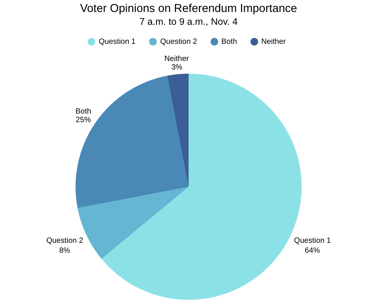 The 100 morning voters were asked which of the two referendum questions they felt strongest about. A total of 64 participants feel that Question 1 is the most important, with eight participants choosing Question 2 instead. Twenty-five participants said “both” referendums matter equally. Three participants said “neither” are important to them.