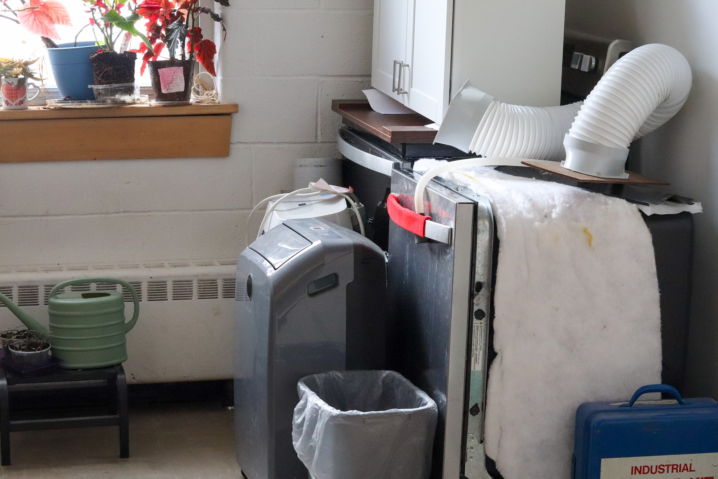 Beginning the tour of the space, Roberge walked toward a pile of appliances in a corridor just outside the women’s bathroom. The collection included several units that once functioned at Crossland Hall, including a dishwasher often used for food-centered community events hosted by the Centre. Roberge, who is 74 and made use of the dishwasher, like many older members of the Centre’s weekly Franco Femmes group, said the university installed a new dishwasher in the temporary kitchen at Libby Hall. It remained in use until a number of small floods occurred.