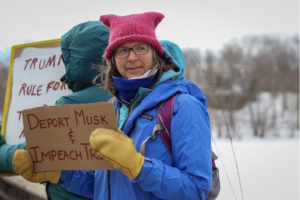 Orono resident Heather Ragner displays her sign that reads “Deport Musk and impeach Trump.” She shared that she’s been supporting similar causes for decades and was thrilled to see a high-turnout from students and young families at the event. Description: Orono resident Heather Ragner stands on the Brandon M. Silk Memorial Bridge while holding a protest sign as part of a locally organized International Women’s Day March.